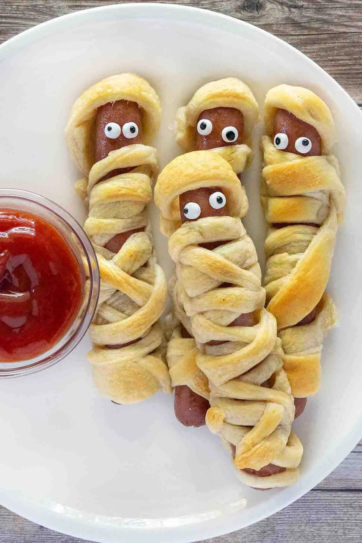 The recipe itself is so easy it’s almost scary. You start with eight hot dogs and a single can of crescent roll dough, which you’ll cut into long, thin strips. These strips become your mummy “bandages,” wrapped around each hot dog like they’re heading to a monster movie premiere. Once they’re all swaddled up (with a little face space left open, of course), they bake until golden, flaky, and bubbling with spooky charm. A quick dot of mustard or ketchup can hold those candy eyeballs in place, and voila, your mummies are ready for the runway – or the buffet table.